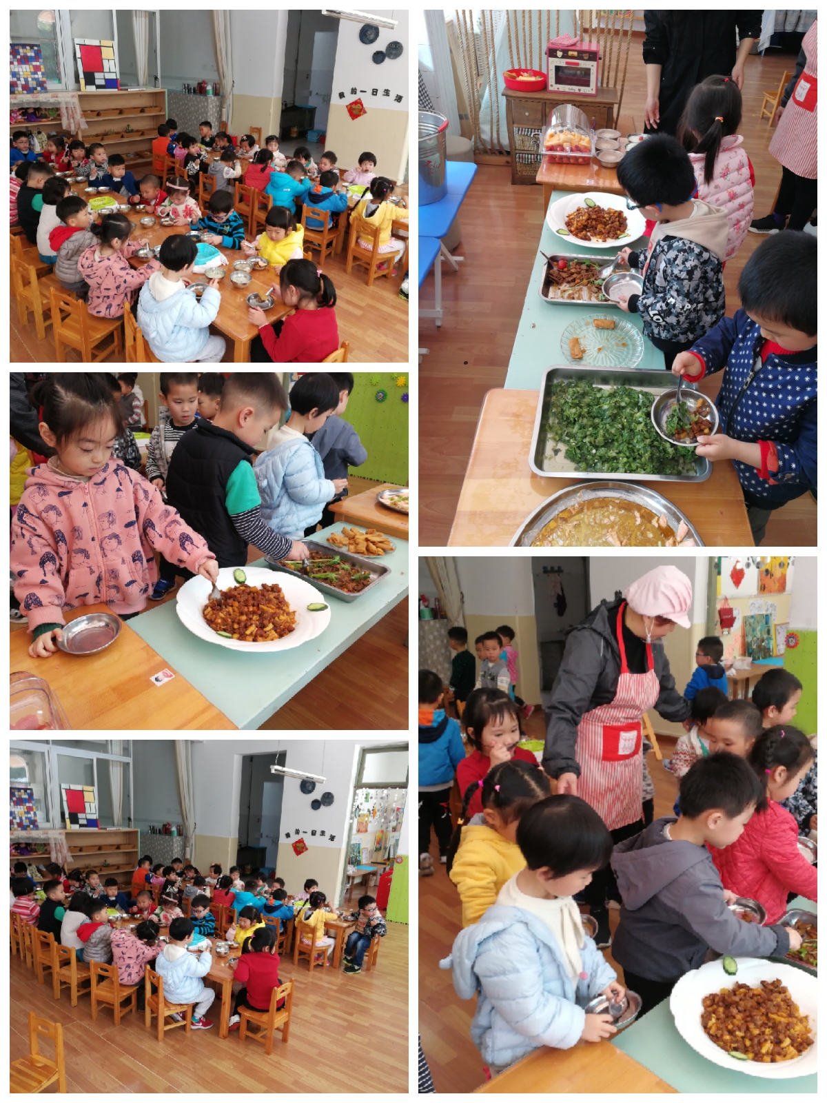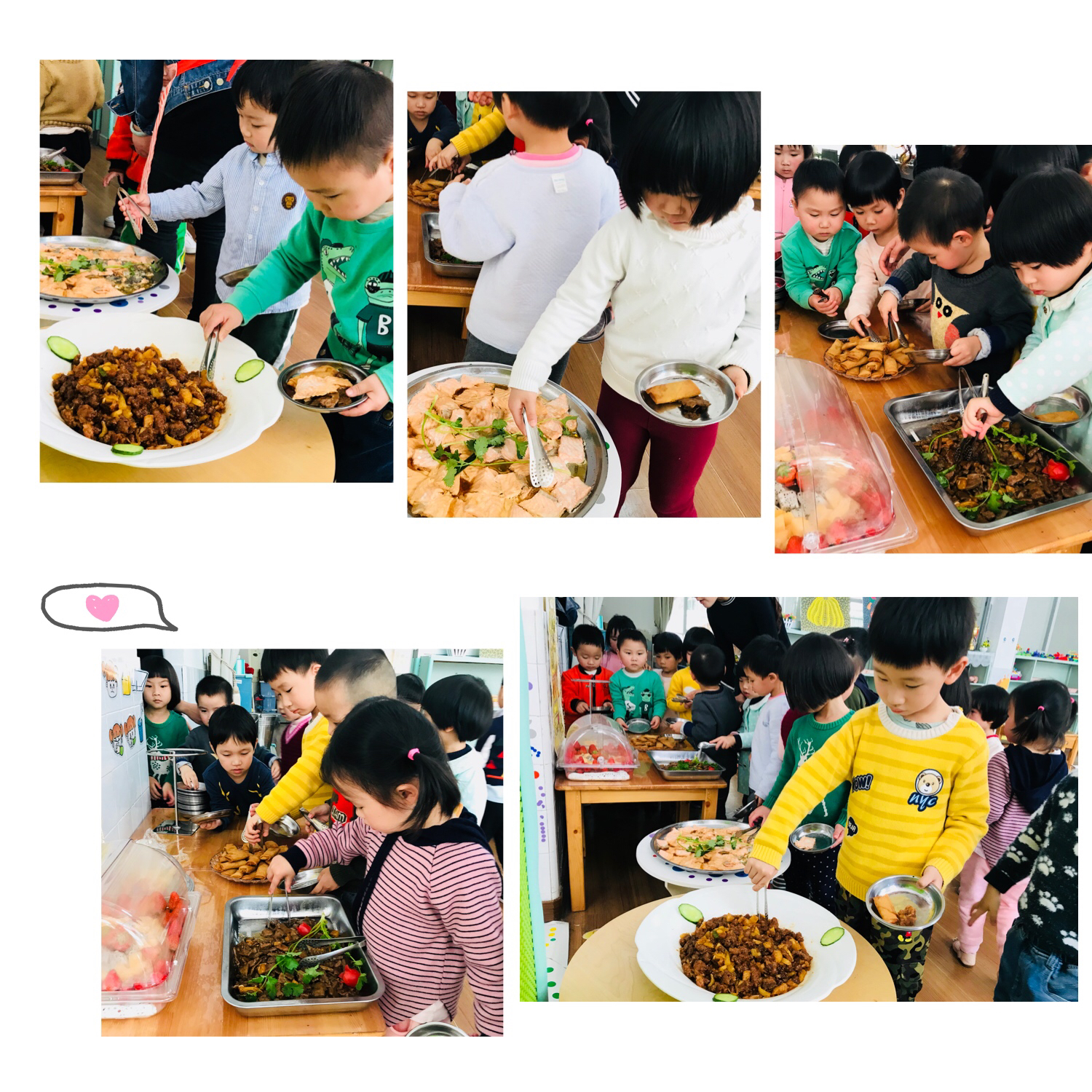 有了上学期的自助餐经验,小班的宝贝已经有了排队自由取餐的意识了,夹食物的技能也熟悉了很多。每个小朋友能够自己去餐盘,夹自己喜欢的食物,排队也很有序,真是棒棒的!