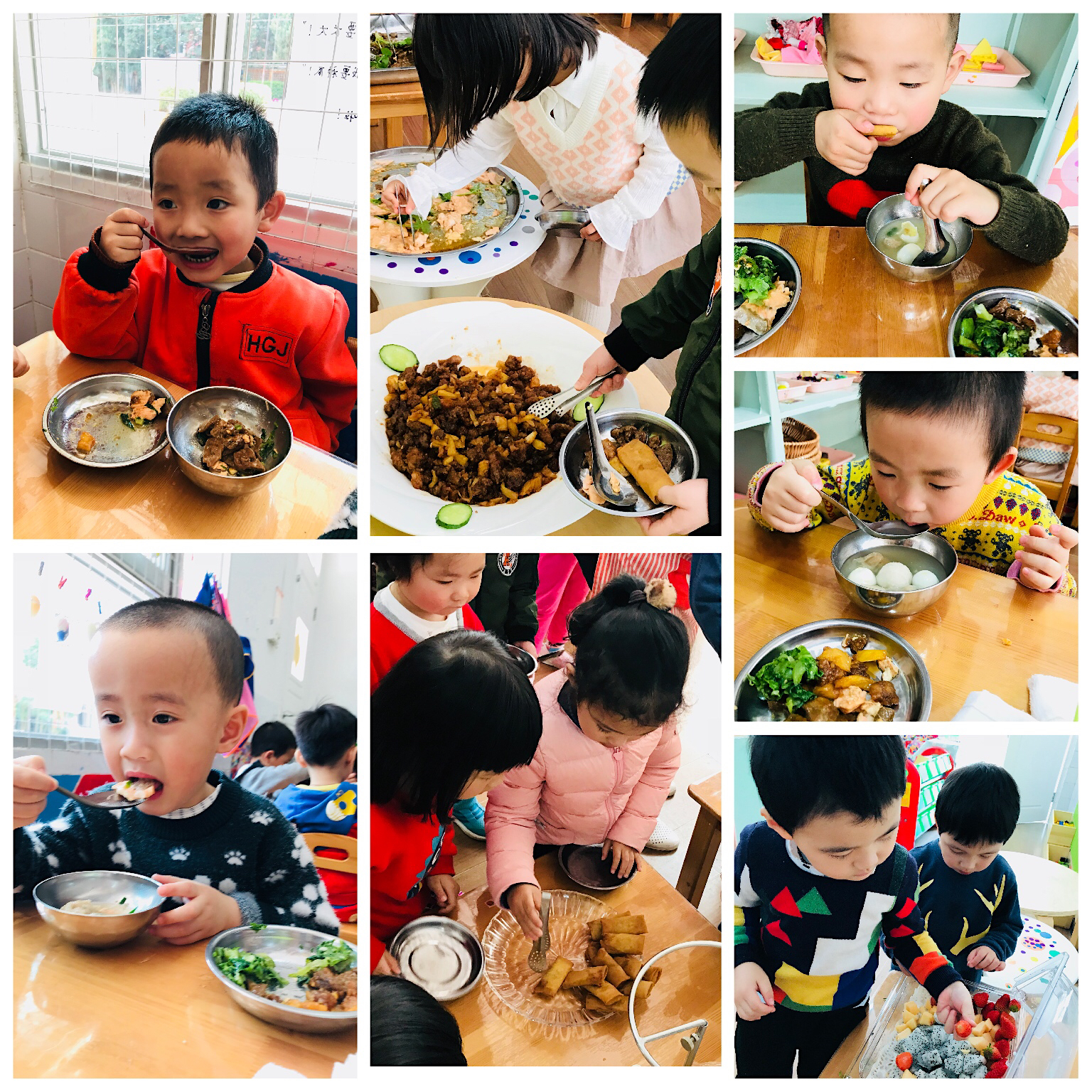 炸春卷和三文鱼非常热捧,还有八宝饭,宝贝们都很爱吃,有的很快就吃完了,吃完还想吃。用孩子们的话说:“哇~福州小吃好好吃,我喜欢吃!”。一个个都吃的很满足。