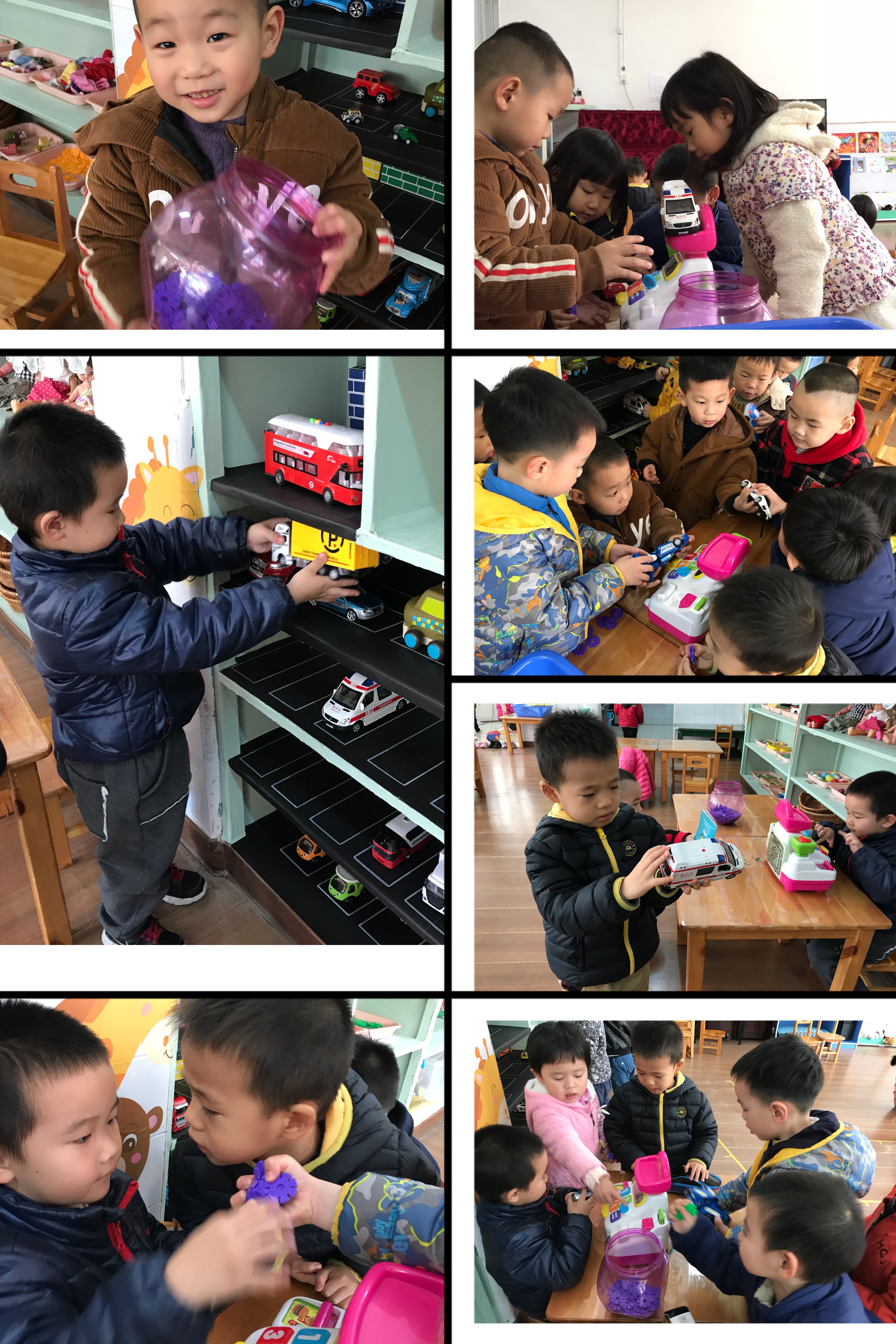 有的班级开汽车商店,有很多不同类型的车子,每天汽车商店也都是爆满的,“老板,消防车怎么卖?”“老板,有没有六块钱的车”。老板们忙得不亦乐乎,也很耐心的讲解车的价格,聪明的老板时不时还会收拾摆放一下车子,吸引更多的顾客,生意越来越好,每天都是收获满满。小朋友表示“当老板真开心!”