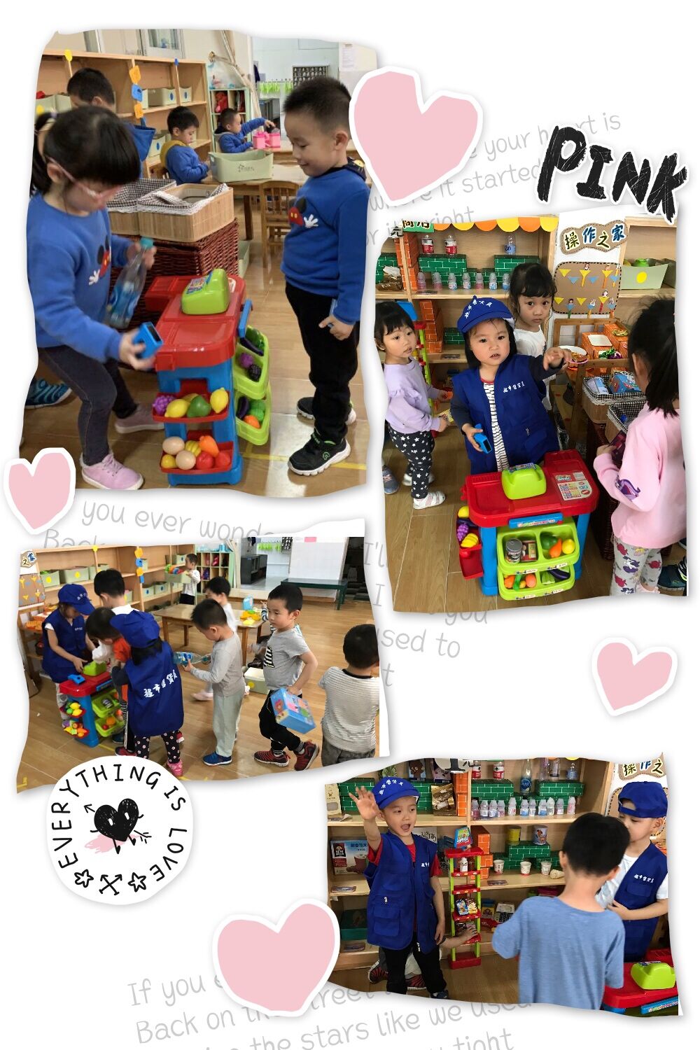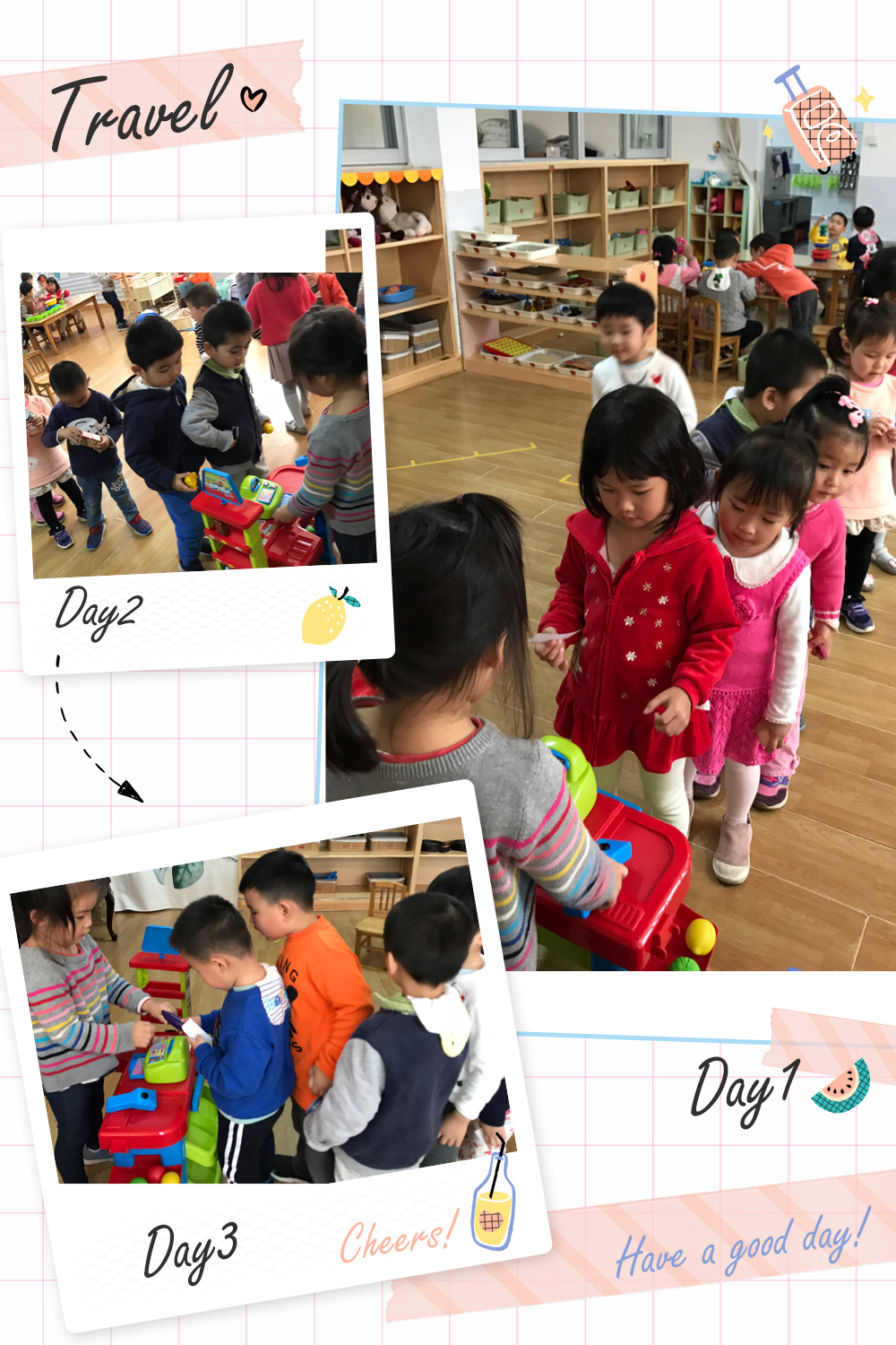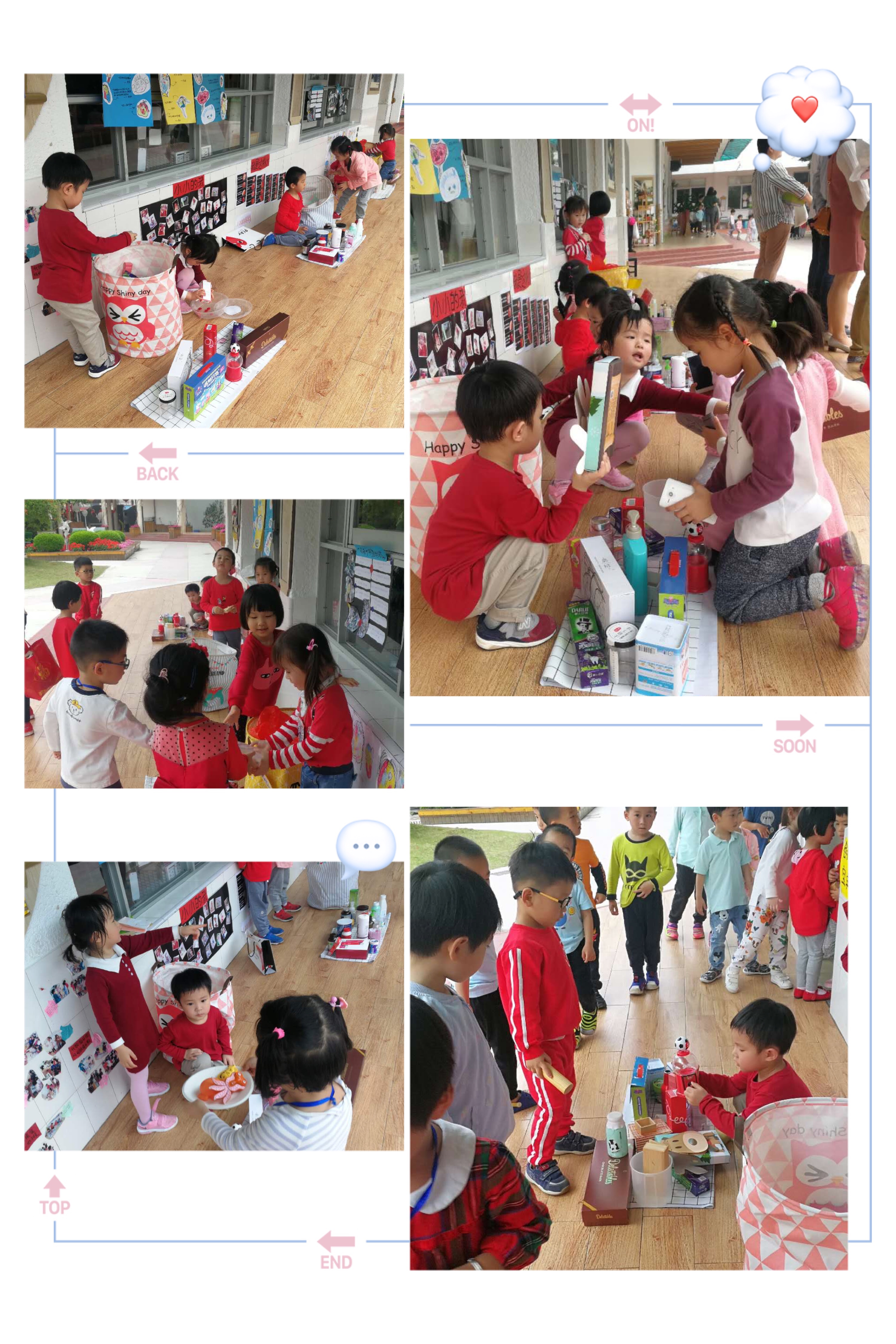 有的班级则是摆地摊,有的卖书,有的卖玩具,有的买生活用品,有的卖水果,有的开医院。。。应有尽有,就像是一个大商场一样。而顾客们带着包包,有的结伴而行一起“逛街”买东西,根据自己的需求买卖商品。