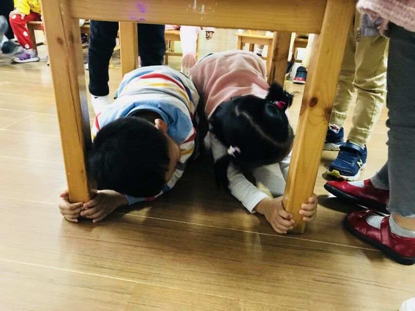 赶紧来学习一下,躲避姿势,注意要所有的身体部位都藏在桌子底下哦!