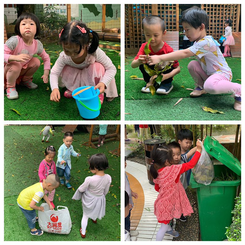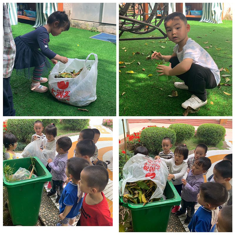 看!我们变成‘小小清洁员’,在幼儿的每个角落捡起了树叶垃圾。小家伙们拿上袋子,桶,篮子,特别认真的一起捡垃圾,还学会了自己倒垃圾,真是太棒了!