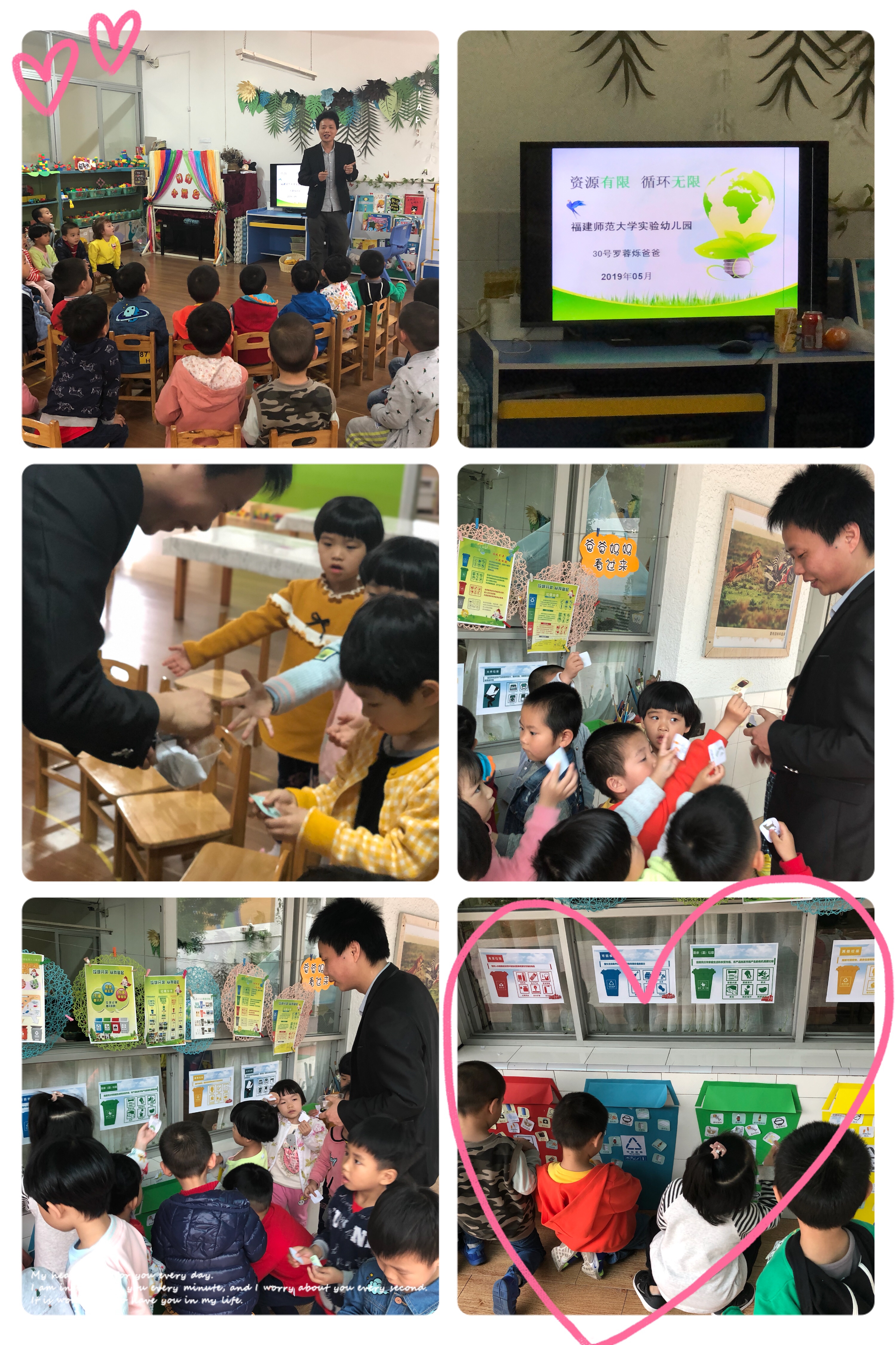 我们请来了家长助教来给孩子们上关于‘资源有限 循环无限’等一些垃圾分类知识。