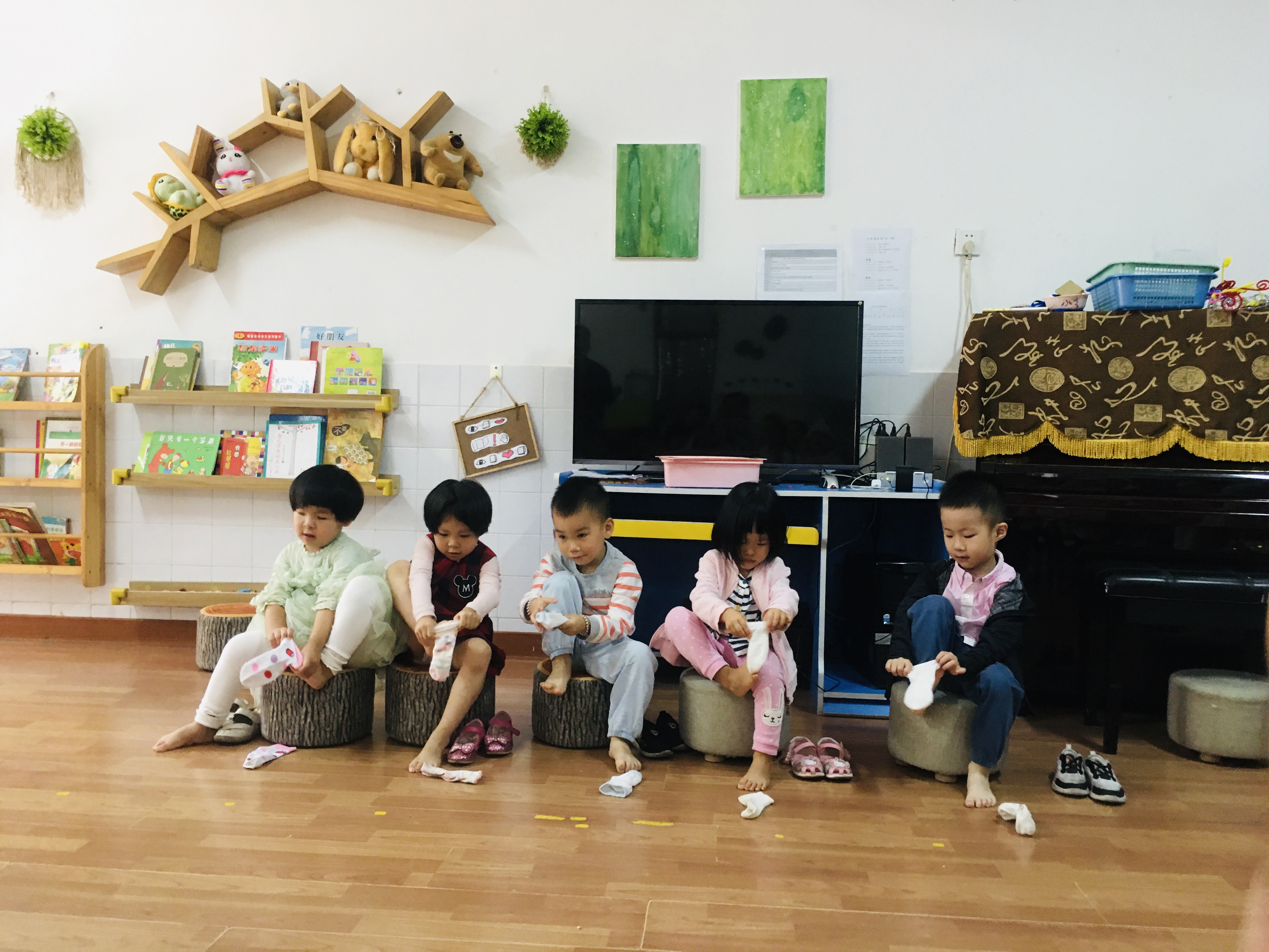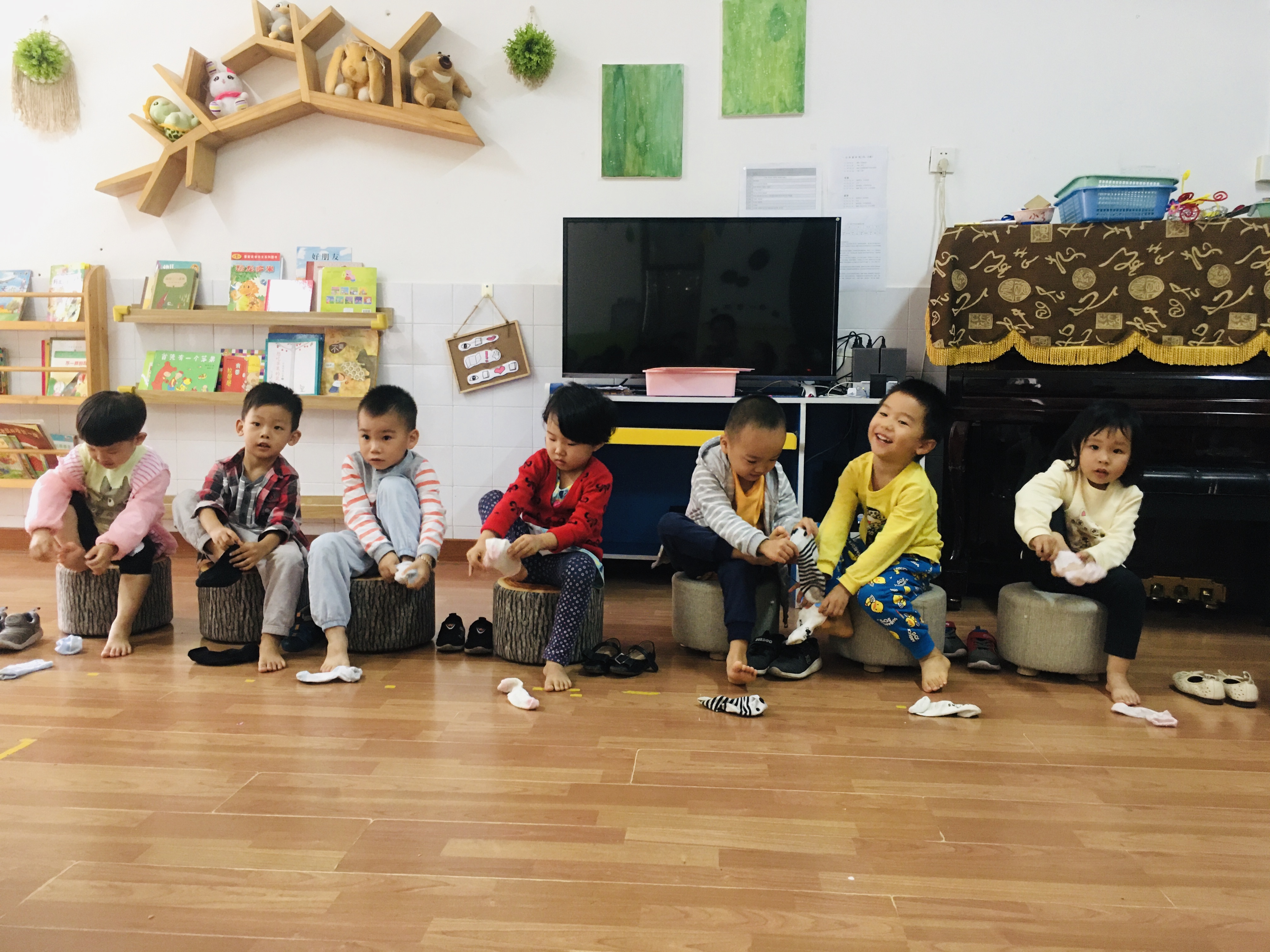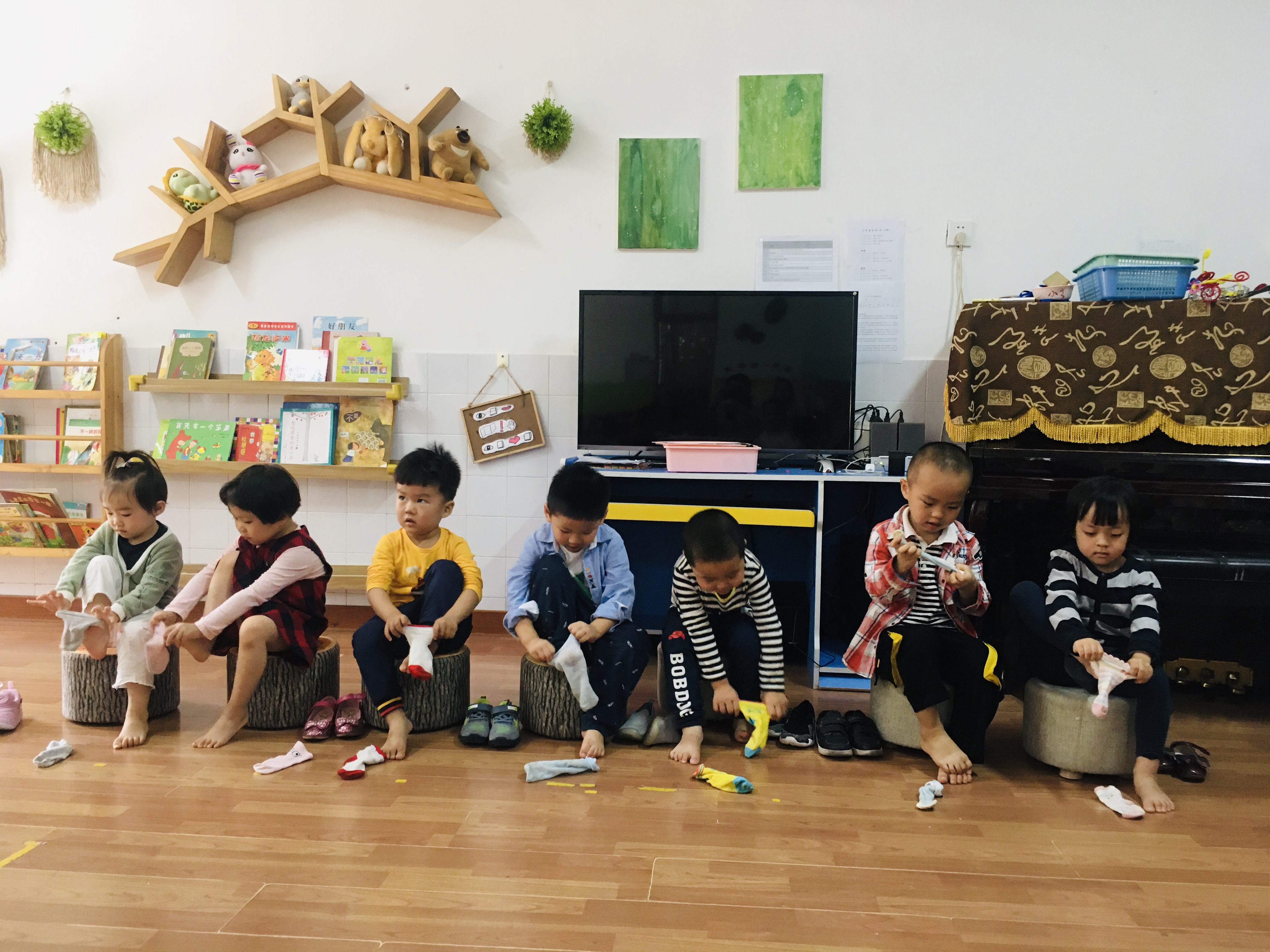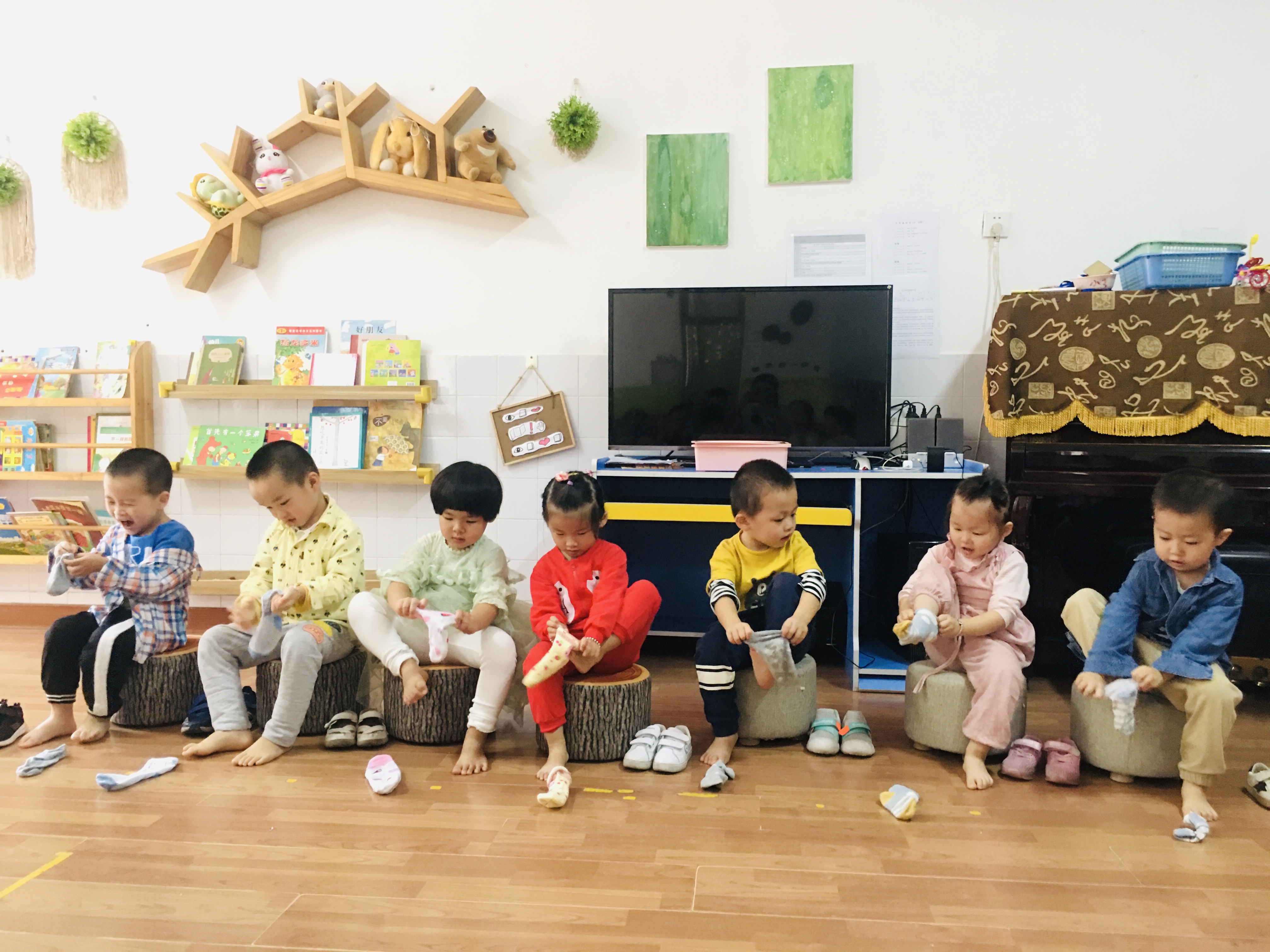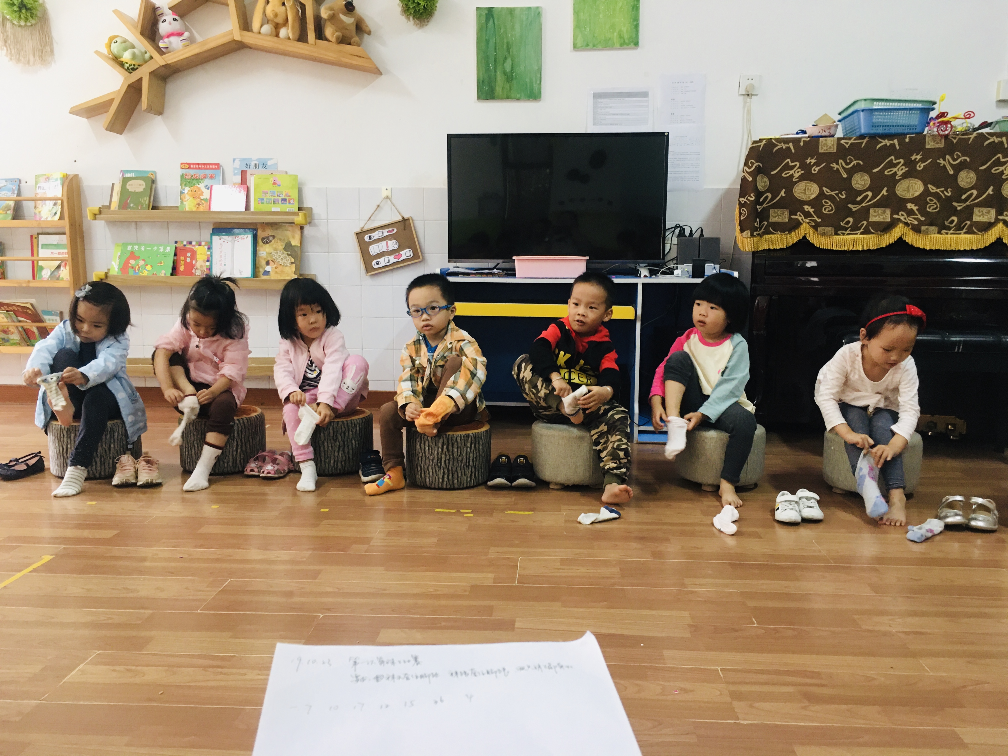 为检验这个月的宝贝技能掌握情况~小二班开启了小班的第一次班级比赛——穿袜子!