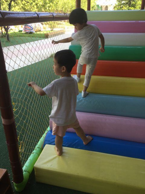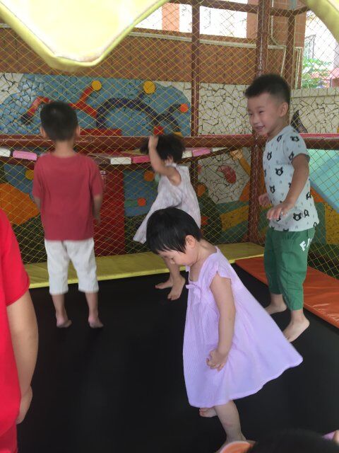 就连这个楼梯也是软的,光着脚丫踩在上面的感觉真好,还有蹦蹦床,脚一蹬,我们就被弹起来了,好好玩。旋转,跳跃我闭着眼~