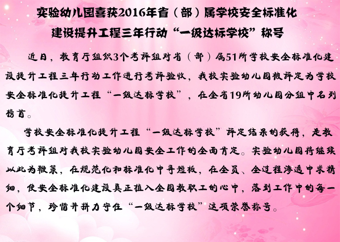实验幼儿园喜获2016年省(部)属学校安全标准化建设提升工程三年行动“一级达标学校”称号