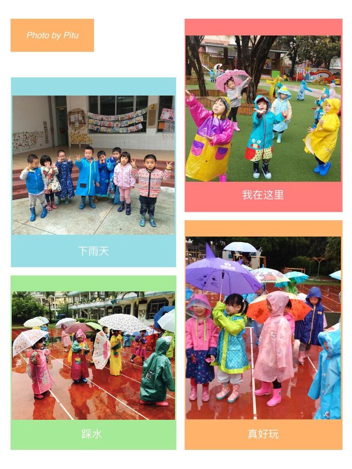 赶上了一个星期的下雨天,孩子们带上了他们各种各样的雨具,在老师的带领下,在户外开展了踩水活动。小朋友对水的喜爱是一种天性,刚穿戴好雨具就欢呼起来,红扑扑的脸上挂满了笑容,老师带着孩子们在水磨石区域玩儿了一会儿,又来到了大操场,让孩子们无拘无束尽情的体验踩水的乐趣。