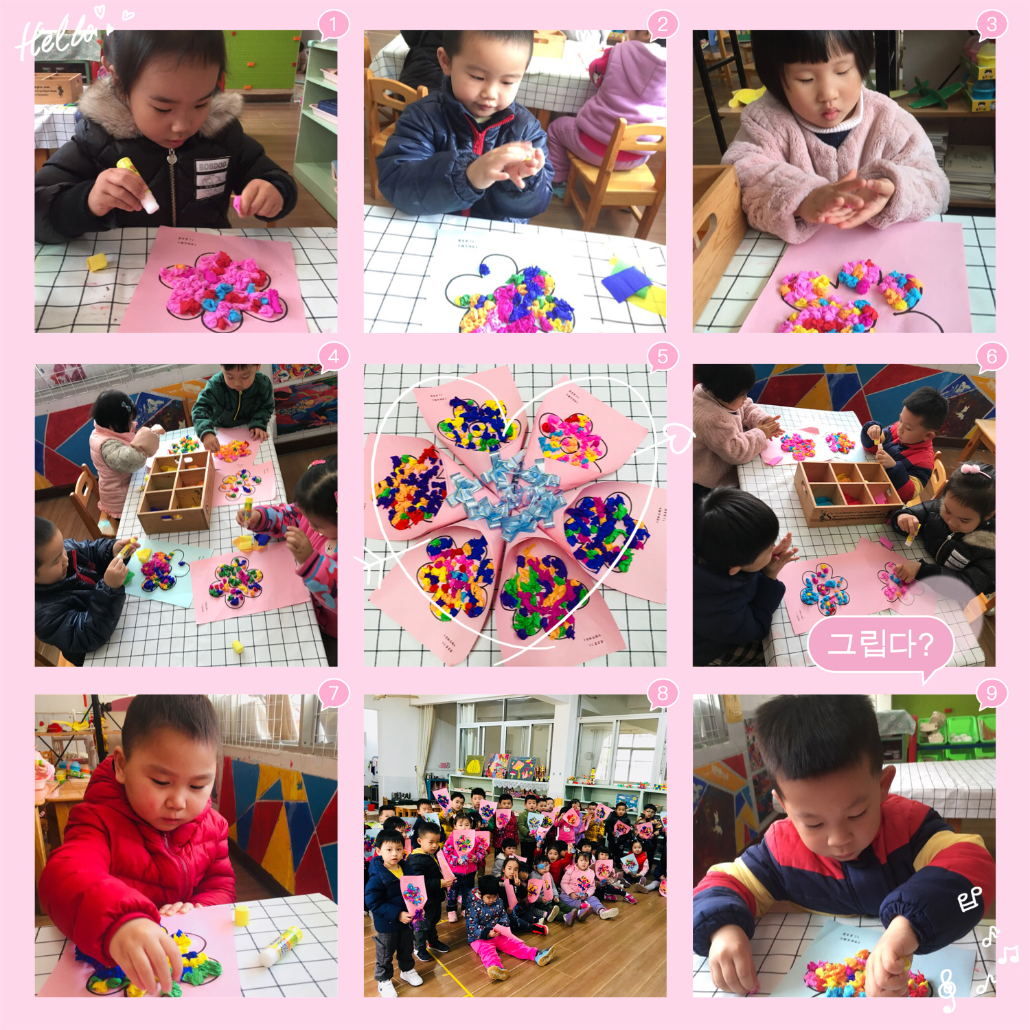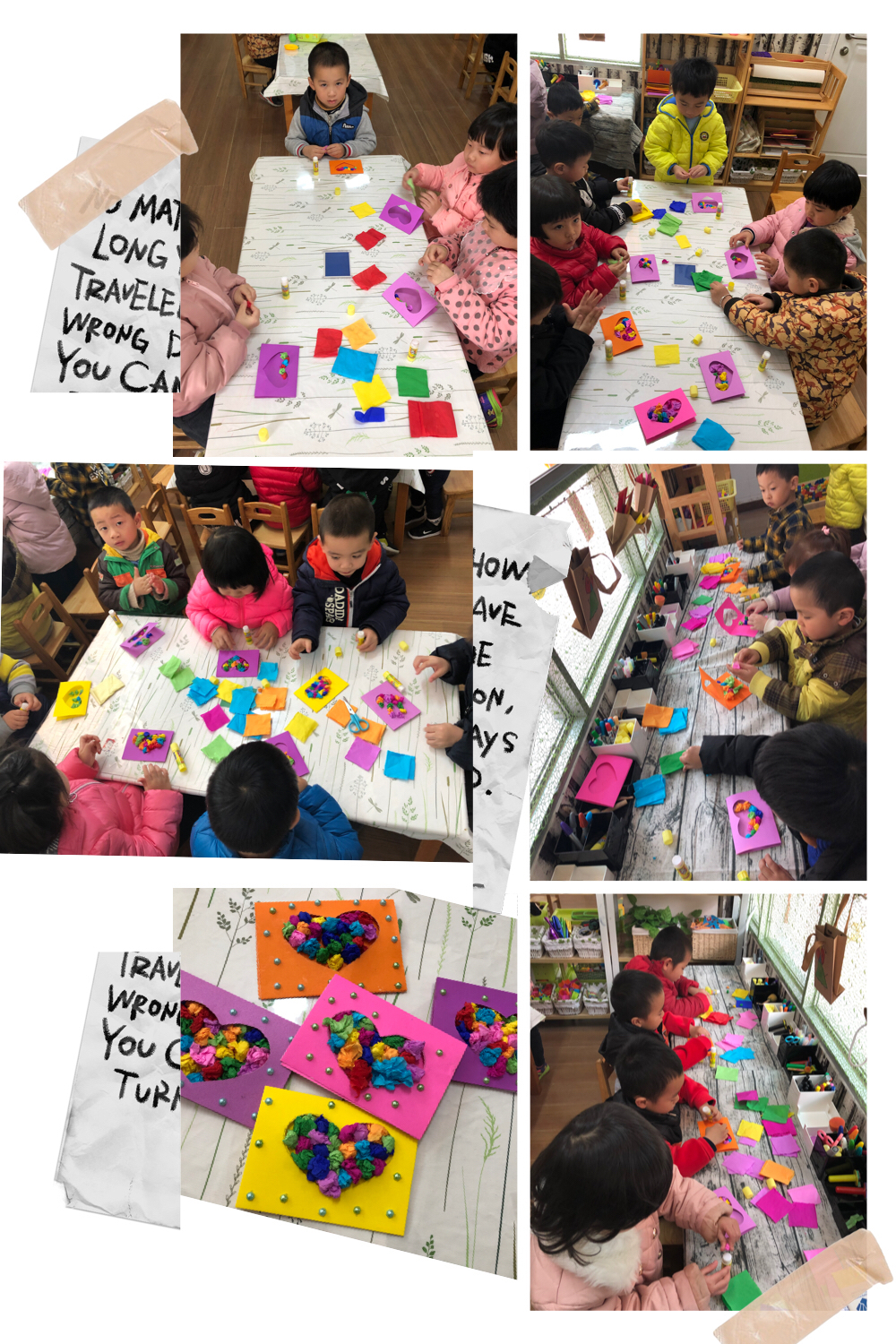 有的班级制作里爱心卡片,每个爱心里贴着满满的皱纹纸,就像小朋友对妈妈,奶奶们的爱一样,满满的,卡片的四周还贴着漂亮的装饰,衬着爱心,显得特别的温馨可爱!